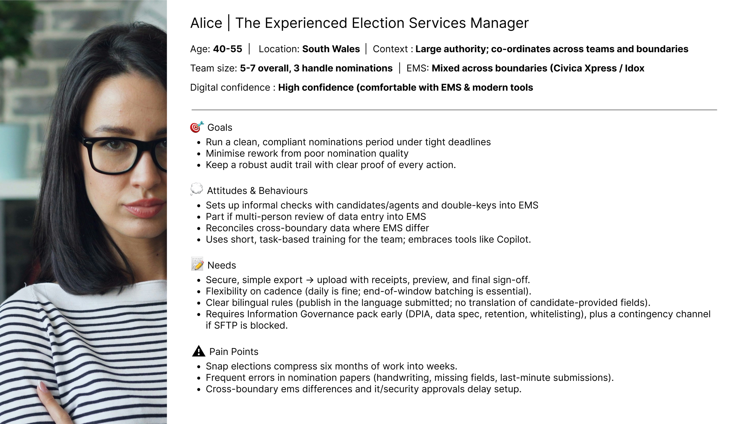 Led 10 usability research sessions with Election Services Managers, Election Agents & Website Admins to test their individual services